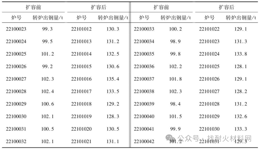 表2為鋼包擴(kuò)容前、后各20爐的轉(zhuǎn)爐出鋼量。從表2中可以看出通過(guò)鋼包修砌工藝的調(diào)整改進(jìn),擴(kuò)容前20爐平均轉(zhuǎn)爐出鋼量為100.77t,擴(kuò)容后20爐平均轉(zhuǎn)爐出鋼量為130.93t,平均轉(zhuǎn)爐出鋼量較擴(kuò)容前增加了30t左右,達(dá)到了預(yù)定目標(biāo)。
