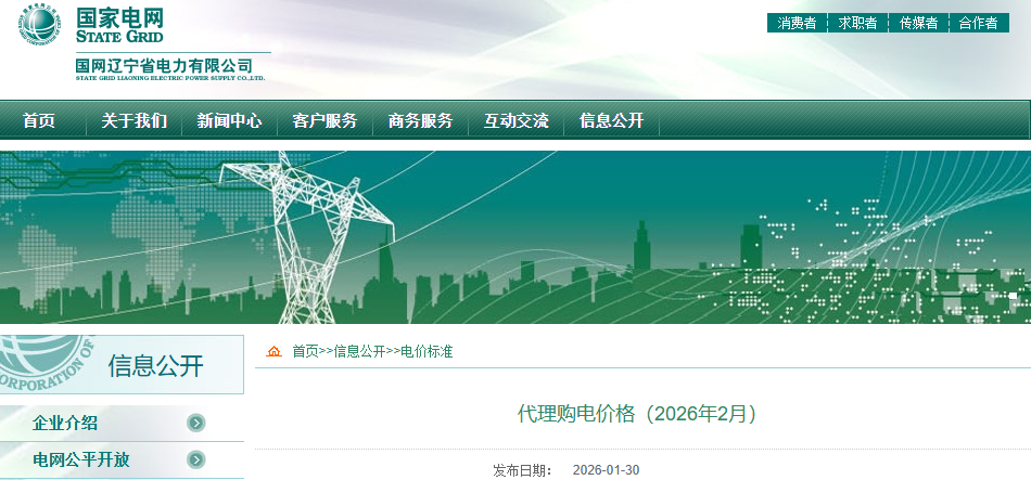 國網(wǎng)遼寧省電力有限公司代理購電工商業(yè)用戶電價(jià)表(2026年2月)