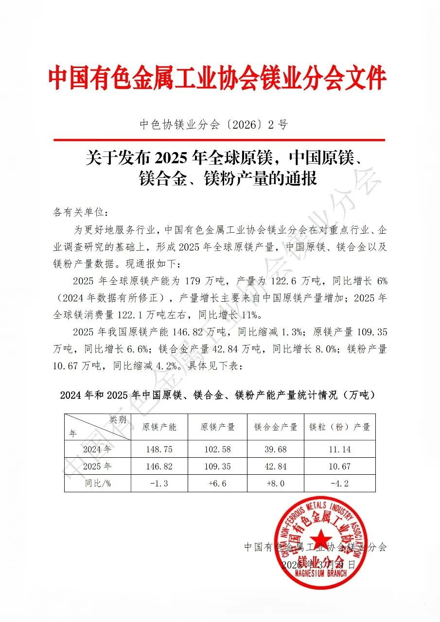 2026年3月9日,中國有色金屬工業(yè)協(xié)會(huì)鎂業(yè)分會(huì)正式發(fā)布《2025年全球原鎂、中國原鎂、鎂合金、鎂粉產(chǎn)量通報(bào)》,完成全球及中國鎂產(chǎn)業(yè)運(yùn)行數(shù)據(jù)的年度更新與歷史修正。